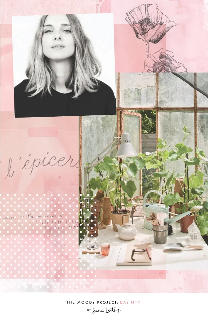 For Day No. 7 I experimented with a different style - and went more for a collage-type of mood board. I was inspired first by the lovely greenhouse image and then I just started playing with textures and patterns from there!